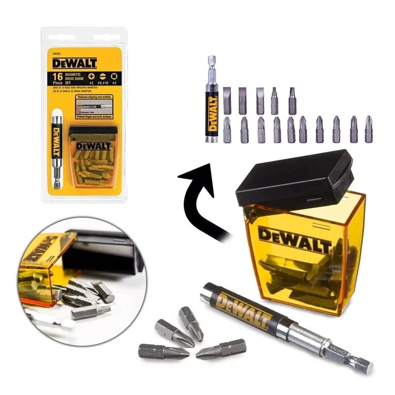 10 Ponta Phillips: #2 com 1? (25,4mm) 02 Ponta fenda: #8 com 1? (25,4mm) 01 Ponta fenda: #10 com 1? (25,4mm) 02 Ponta quadrada: #2 com 1? (25,4mm) 01 Adaptador - Extensão compacta magnética com guia.